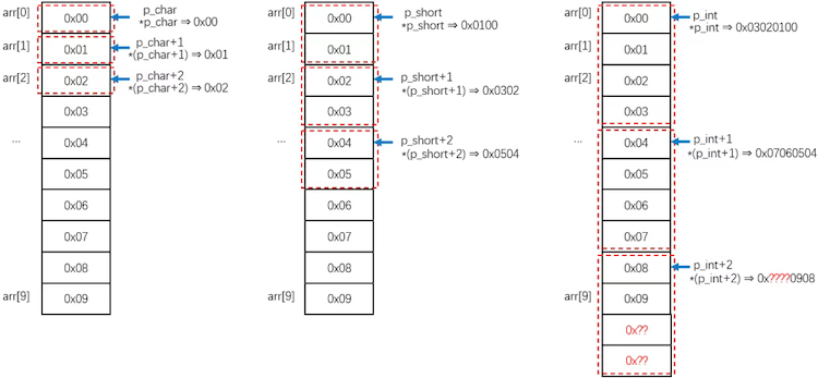 char*,short*,int*虽指向同一地址,但解引用或++/--时需考虑类型信息确定偏移量;